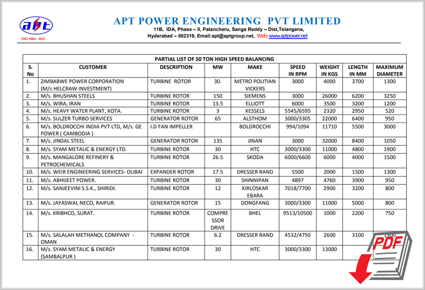 For the smooth running of the rotor, the latest market requirement is balancing the rotor at rotating speed. To cater to the needs of the customers M/S. APT Power Engineering (P) Ltd, have established a High-Speed Balancing facility. Our HSBT is one of its kind in India with computer-aided balancing. It can accommodate complex rotors up to 50 Tons with balancing speed up to 16000 rpm of various power and process plant customers and OEMs as per API 612, API 617 & ISO 1940 standards. Racing against the clock, APT staff delivered the rotors on times.APT performs rotating speed balancing of rotor and High Speed balancing of rotor.
